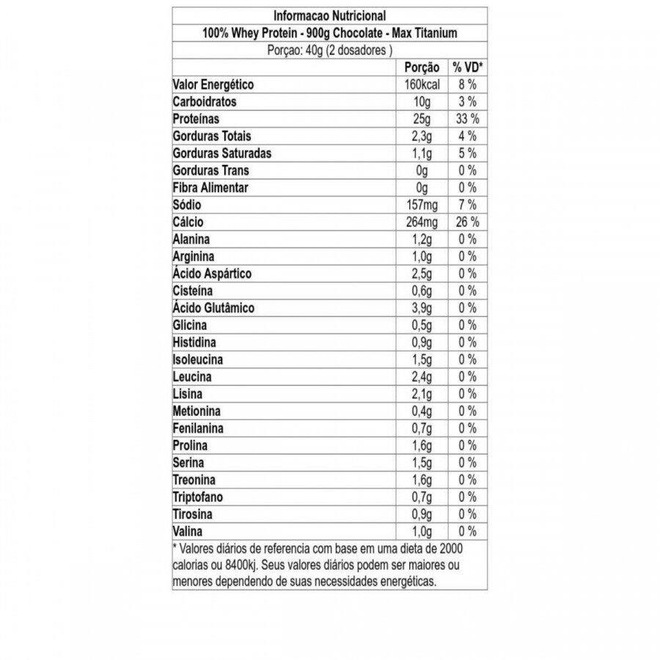 100% WHEY PROTEIN MAX TITANIUM conte#769 m 25g de protei#769 na por porc#807 a#771 o.Do ponto de vista aminoaci#769 dico, as protei#769 nas do soro do leite apresentam quase todos os aminoa#769 cidos essenciais (que na#771 o produzimos em nosso corpo).