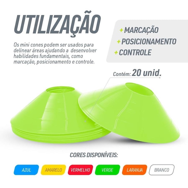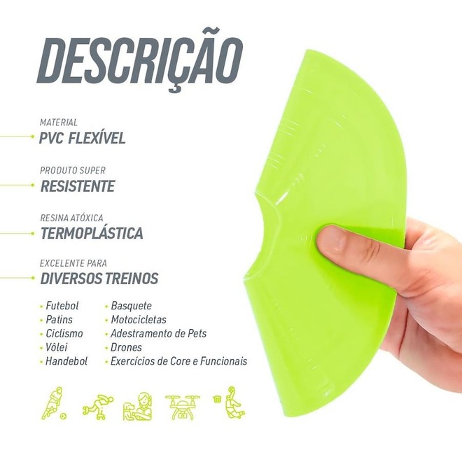 Cones de agilidade modelo prato demarcatório ou chapéu chinês. Ideal para agilidade e coordenação em esportes. Dimensões: 20x20x5 cm (C x L x A). Marcação em campos e quadras para ganhos de velocidade. Cores vibrantes para fácil visualização, flexível, durável. Treina velocidade, agilidade, coordenação, equilíbrio. ESPECIFICAÇÕES: ? Material: Polímero siliconado flexível e durável. ? Dimensões: 20 x 20 x 5 (C x L x A). ? Quantidade: 20 unidades. ? Marca: Pista e Campo. ? Cor: Verde ? Dobrável: Sim ? Lavável: Sim ? Outros: NÃO acompanha suporte para o chapéu.ref: M14980