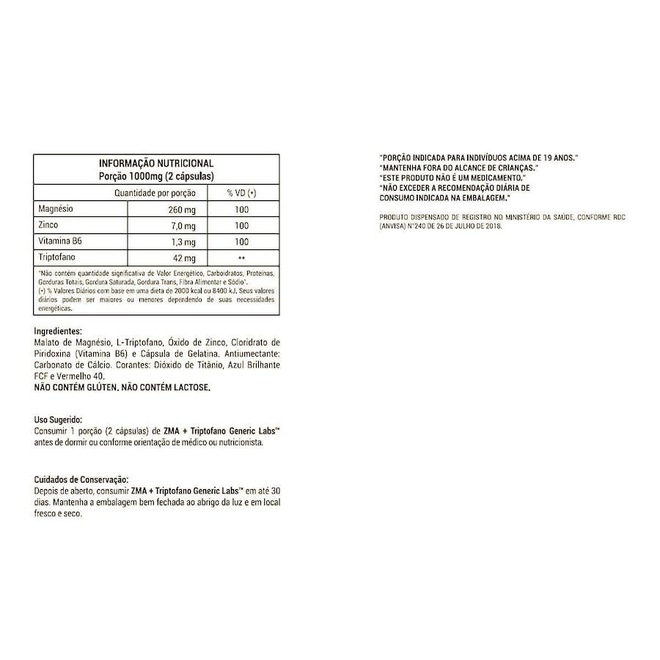 Kit ZMA + Triptofano Testbooster Generic Labs - 60 Cápsulas - 3 Unds