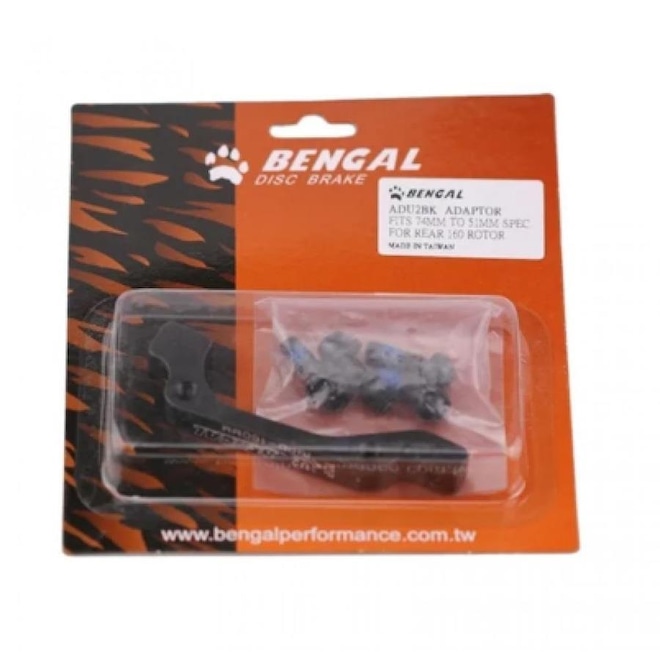 Adaptador Bengal para freio a disco dianteiro de 160mm ou traseiro de 140mm, na cor preta, em alumínio resistente.