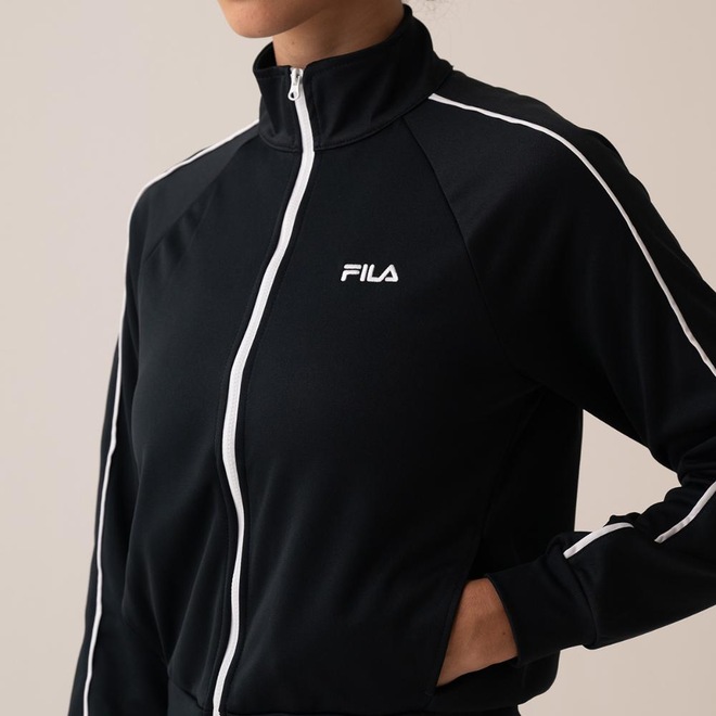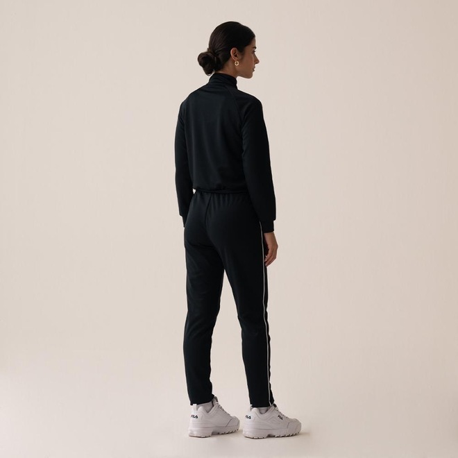 Agasalho feminino em malha sustentável de poliéster reciclado, com jaqueta slim fit ajustada, gola alta, zíper frontal, bolsos laterais e vivos contrastantes nas mangas. A calça tem modelagem slim, cintura média, cós com elástico e cordão interno, vincos pespontados, bolsos laterais e vivos contrastantes. Logos FILA Letter bordados completam o estilo. Comprimento total da calça: 96 cm.