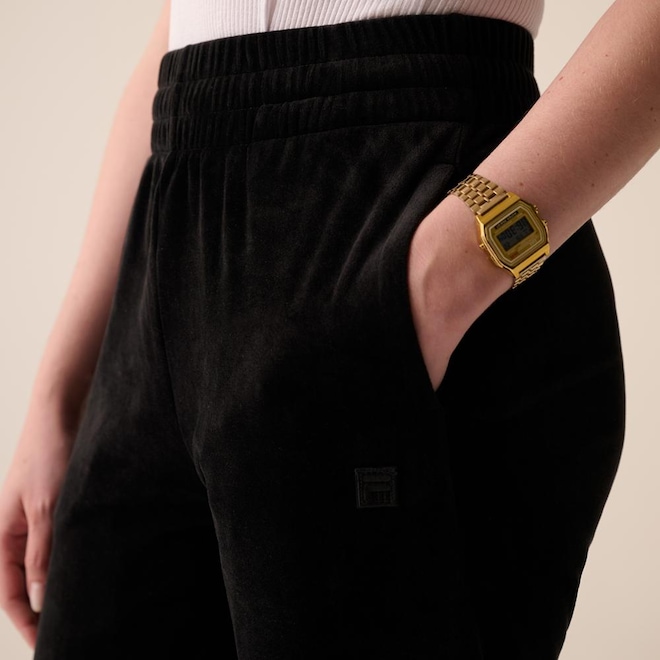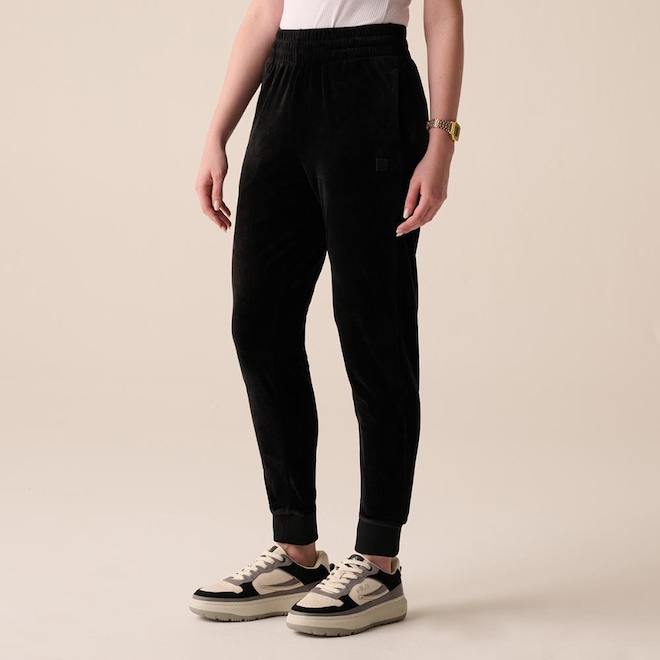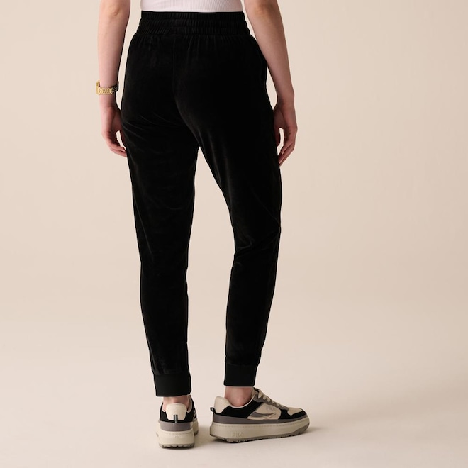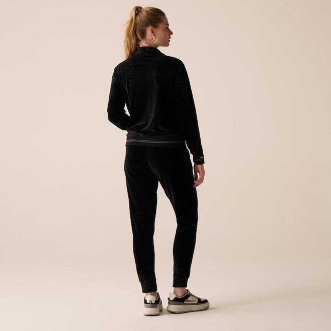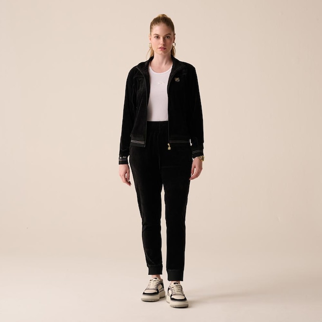 Agasalho feminino confeccionado em veludo. Modelagem regular nas duas peças. A jaqueta possui gola alta, abertura frontal em zíper com puxador F-Box metálico dourado, bolsos laterais, detalhe com vivo contrastante na parte frontal seguindo até os punhos das mangas, barra em ribana, punhos em ribana com detalhe bordado somente no punho direito e patch F-Box monocolor aplicado na parte frontal esquerda superior. Calça com cós de elástico, cordão de ajuste interno com ponteira metalizada dourada, bolsos laterais, punhos da barra em ribana e patch F-Box ton sur ton aplicado próximo ao bolso esquerdo. Comprimento total calça: 93 cm.ref: M17LP1