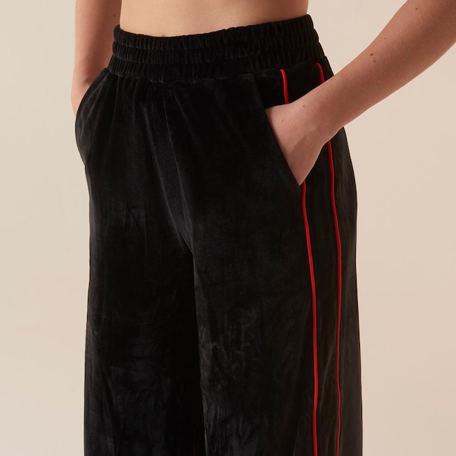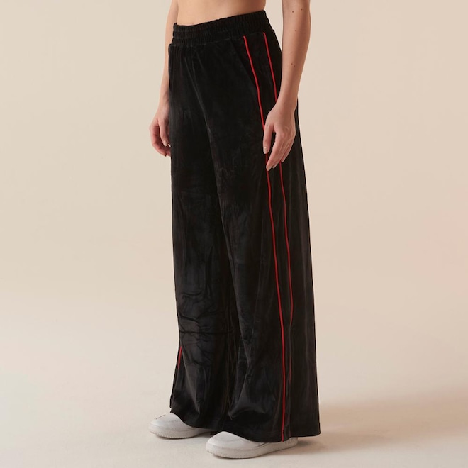 Calça: com modelagem wide, tem cós elástico, cordão para ajuste e bolsos laterais, além de vivos contrastantes.