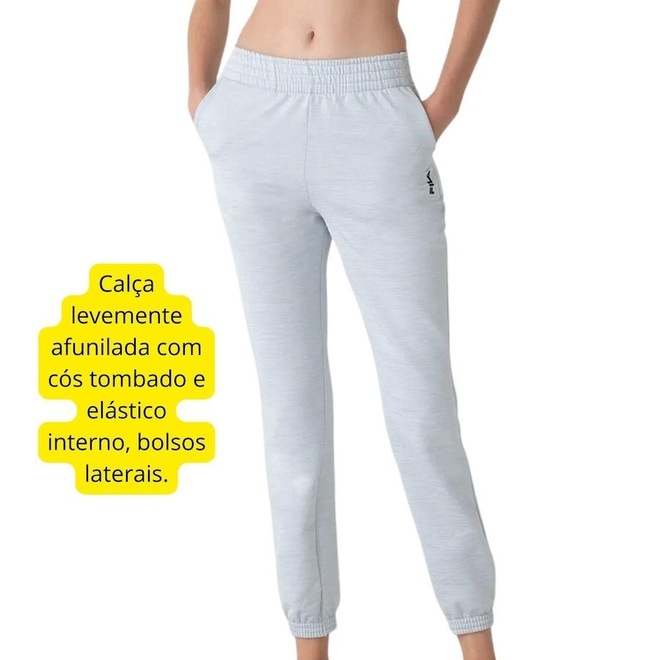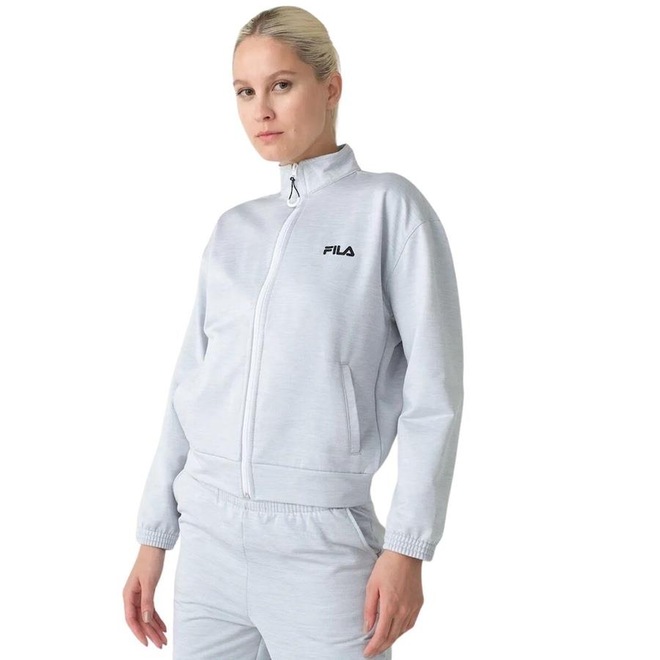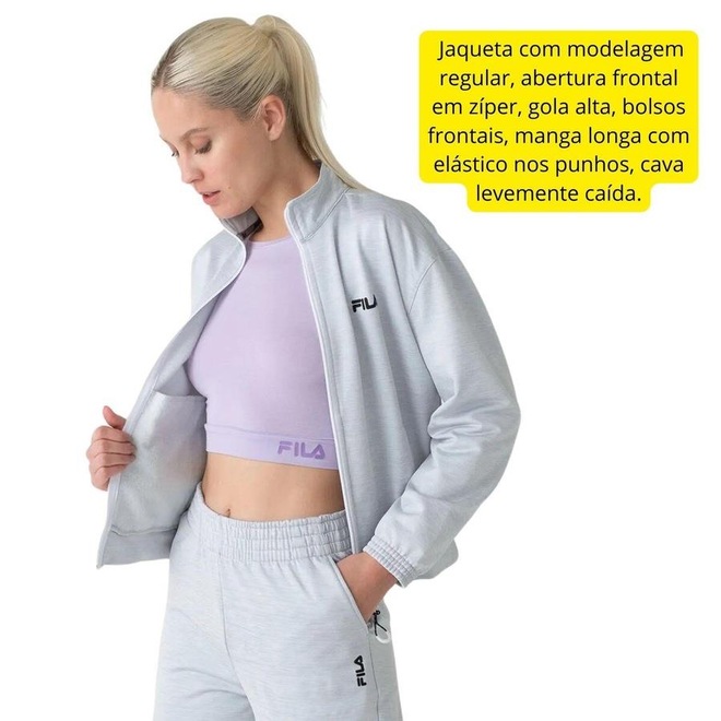 Conjunto de agasalho feminino com efeito flamê confeccionado em malha de poliéster com elastano. Jaqueta com modelagem regular, abertura frontal em zíper, gola alta, bolsos frontais, manga longa com elástico nos punhos, cava levemente caída e aplique 3D de logo Fila Letter na parte frontal esquerda superior. Calça levemente afunilada com cós tombado e elástico interno, bolsos laterais, barra tombada com elástico interno e aplique 3D de logo Fila Letter próximo ao bolso esquerdo. Comprimento total da calça: 101 cm.