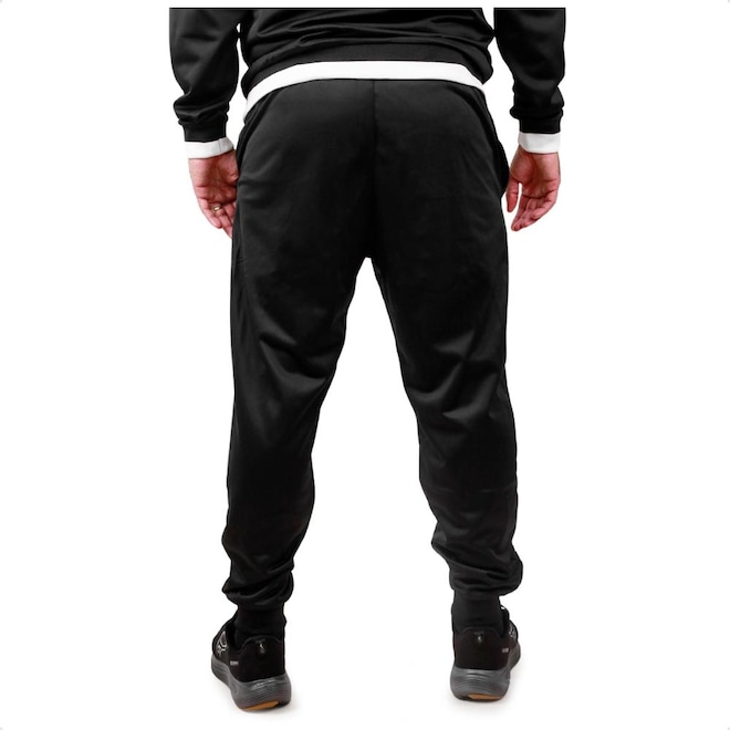 A calça possui estilo jogger, com abertura da perna com barra de ribana e cós elástico com cordão interno para ajuste personalizado.