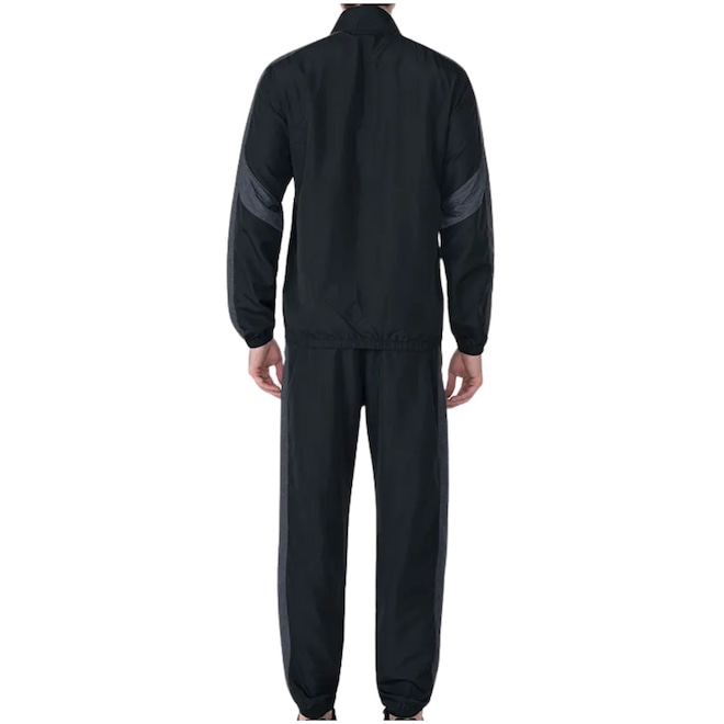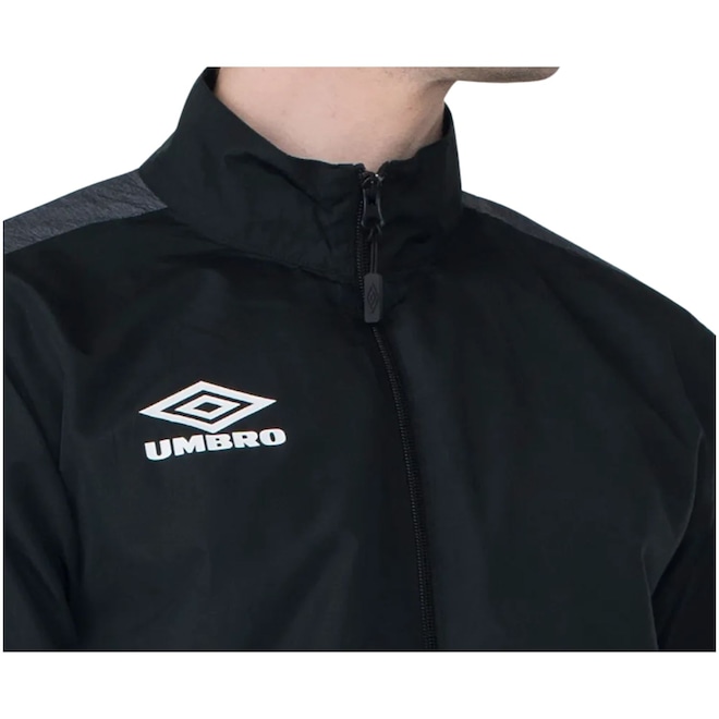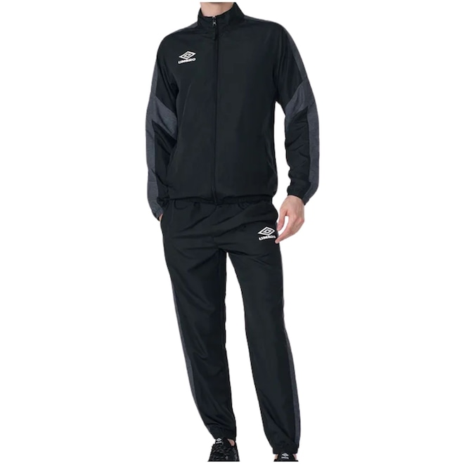 Conjunto esportivo masculino fabricado em tecido sintético com elasticidade. Casaco com abertura frontal por fecho, gola alongada, manga comprida com modelagem diferenciada e detalhes em tecido de textura variada, bolsos na frente, extremidades das mangas e parte inferior com elástico costurado internamente e o símbolo da Umbro aplicado na parte superior direita da frente. Calça com modelagem ajustada nas pernas, cintura com elástico e cordão interno para ajuste, bolsos nas laterais, extremidade das pernas com elástico, detalhes laterais em cores contrastantes, costura reforçada na região do gancho e o símbolo da Umbro aplicado próximo ao bolso esquerdo.
