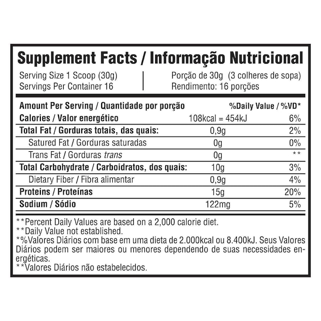 Ingredientes: Proteína concentrada do soro do leite, albumina, proteina concentrada da soja, proteina isolada da soja, ovo em pó, aroma natural e sintético identico ao natural, espessante goma xantana..