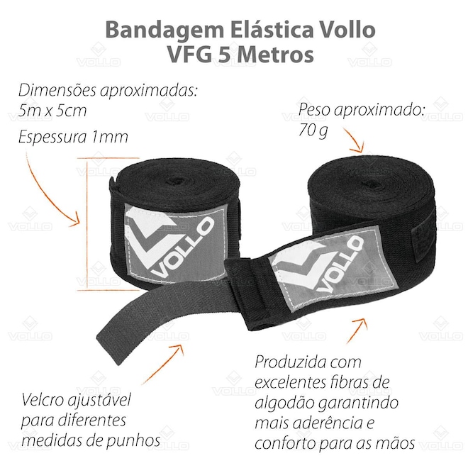 Bandagem Elástica Boxe Muay Thai 5 Metros Vollo PretaDesenvolvida para profissionais e amantes de artes marciais, a Bandagem Elástica Vollo VFG 5 Metros tem um papel muito importante na prática de atividades como o boxe por exemplo, pois com ela é possível uma melhor absorção de impactos, reduzindo o risco de possíveis lesões e atritos. A bandagem é um acessório essencial para garantir segurança e proteção na prática de lutas e artes marciais, como Boxe, Muay Thai, Kickboxing, Taekwondo e MMA.