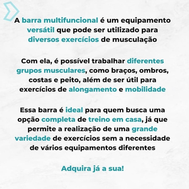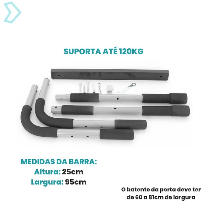 Barra Multifuncional de Porta P/ Musculação Fixa e Portátil - A Barra Multifuncional permite uma variedade de exercícios possibilitando trabalhar diversas áreas do corpo, como: costas, abdômen, bíceps e tríceps. Ótimo para desenvolver músculos e resistência física sem sair de casa. Descrição TÉCNICA Cor: Material: Aço com proteção de Espuma Inclui: 1 Barra Multifuncional 1 Kit para montagem 1 Manual montagem Dicas de Compra: - Leia todo o anúncio antes de comprar. - Caso ainda tenha alguma dúvida sobre o produto, utilize o campo de perguntas. - Estaremos sempre à disposição para melhor atender e resolver. - Importante verificar todos os seus dados, para que não ter problemas com a entrega. - Após a compra autorizada, enviaremos em até 24 h. - Após o recebimento do seu produto e se tiver alguma dúvida ou problema, utilize o chat, pois estaremos prontos para solucionar.