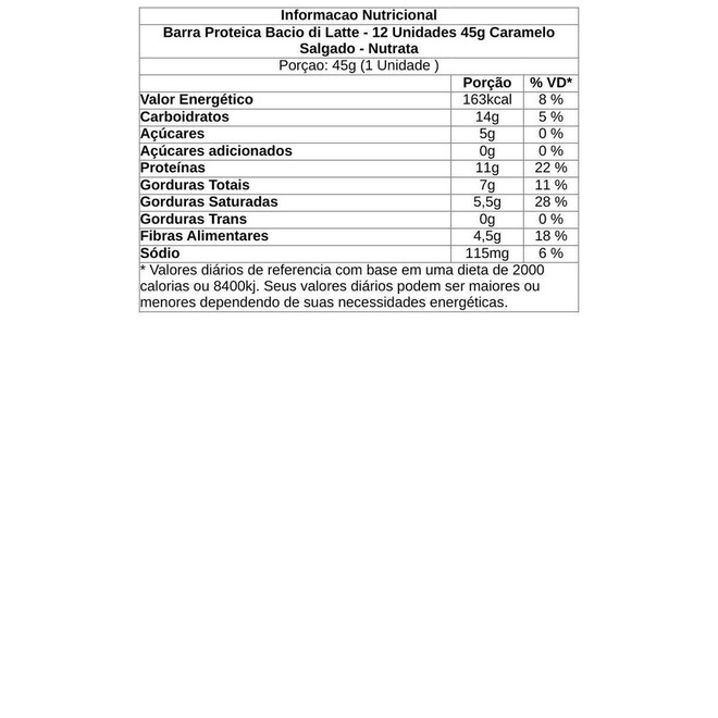 Ingredientes: Recheio sabor caramelo salgado (maltitol, polidextrose, gordura vegetal, leite em pó desnatado, cacau em pó, aromatizantes, emulsificante lecitina de soja, espessante pectina, edulcorante glicosídeos de esteviol de Stevia rebaudiana Bertoni e corante extrato de urucum, base norbixina), cobertura sabor chocolate meio amargo (gordura vegetal, cacau em pó, soro de leite em pó, edulcorante maltitol, emulsificante lecitina de soja, conservante sorbato de potássio e aromatizante), colágeno hidrolisado, proteína de soro do leite concentrada, caseinato de cálcio, proteína concentrada de leite obtida de leite bovino, gordura de palma, crispies sabor caramelo salgado (amido de mandioca, polidextrose, soro de leite em pó, gordura vegetal, leite em pó desnatado, farinha de arroz, cacau em pó, aromatizantes, corantes caramelo I e corante extrato de urucum, base norbixina, emulsificante lecitina de soja, estabilizante goma xantana e edulcorante glicosídeos de esteviol de Stevia rebaudiana Bertoni), frutooligossacarídeos (FOS), proteína de soro do leite isolada, polidextrose, iogurte em pó, cacau em pó, edulcorantes xarope de sorbitol e xarope de maltitol, umectante glicerol, emulsificantes goma acácia e lecitina, antiumectante fosfato tricá ...ref: M18EF8