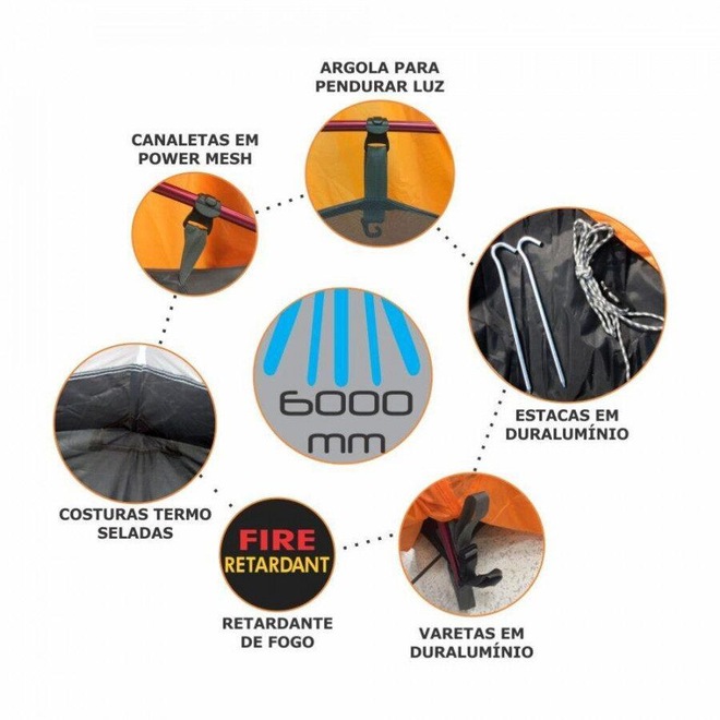 Seu sobreteto é fabricado em poliéster siliconado tipo ripstop e costuras seladas, que garante impermeabilização de até 6.000mm de coluna d''água.