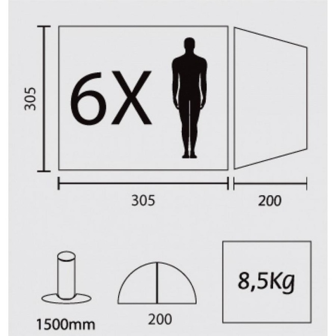 Barraca Zeus para 6 pessoas, feita em poliéster 190T High Quality, ela possui entrada dianteira e janelas laterais com mosquiteiro, coluna d´água de 1500mm, alta resistência à chuva, costura selada com fita de silicone, piso em poliuretano de alta resistência anti fungo e varetas em fibra de vidro.