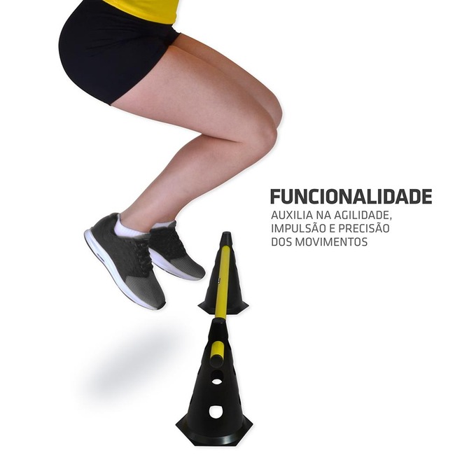 - Sobre o produto - Barreira de Salto com Cone Muvin - 24cm- Ajustável para as alturas de 7cm, 14cm ou 19cmDesmontávelPossibilidade de uso dos cones isoladamente em outras atividadesIdeal para treinos de agilidade e velocidadeA Barreira de Salto com Cone da Muvin Esportes foi desenvolvida para treinamentos funcionais e esportivos, auxiliando no desenvolvimento de agilidade, impulsão e precisão nos movimentos.Resistente e durável, a barreira de salto com cone é composta por dois cones de 24cm e um bastão produzidos em polietileno e PVC rígido. - Ela pode ser usada individualmente ou em conjunto com outras barreiras do mesmo modelo formando circuitos personalizados.Os cones que formam a barreira de agilidade possuem furos em diferentes alturas para o encaixe do bastão, configurando rapidamente o nível desejado. - A base possui formato hexagonal, promovendo boa estabilidade e firmeza aos cones. - Ela pode ser ajustada para as seguintes alturas: 7cm, 14cm ou 19cm.A barreira de salto com cones pode ser utilizada em diferentes treinos de modalidades esportivas como futebol, basquete, handebol, voleibol, entre outros - em treinos para melhorar agilidade, velocidade e impulsão. - Com elas é possível desenvolver uma maior velocidade e força de explosão, ao mesmo tempo que fortalece os músculos das pernas e do abdômen.Para os apaixonados por atividades físicas, as barreiras de agilidade com cone são ideais para um bom treino funcional, pois os movimentos envolvidos no salto trabalham a região lombar e abdominal, estabilizando e equilibrando o tronco. - Com isso, elas auxiliam no fortalecimento de panturrilhas, coxas e músculos abdominais, contribuindo para uma boa forma.Presente em treinos funcionais, a barreira de salto com cone permite criar diferentes circuitos e tarefas para aprimorar a resistência e ter maior performance. - Os músculos das panturrilhas, coxas e abdômen são ativados e fortalecidos durante os saltos. - Para aqueles que pretendem queimar as calorias de forma rápida e prática, a barreira de salto com cone é ideal para dar início aos exercícios por meio de séries simples e fáceis de serem executadas.Além de ser utilizada em treinos esportivos, muitos utilizam as barreiras de agilidade com cone para adestramento e reabilitação de cães, melhorando as habilidades físicas e sensoriais dos animais.As barreiras de salto com cone também estão disponíveis nos cones de altura de 50cm, que possibilitam o ajuste da altura em 21cm, 31cm e 41cm. - As barreiras também estão disponíveis em kits de 3, 6 e 12 unidades. - ref: M034H9