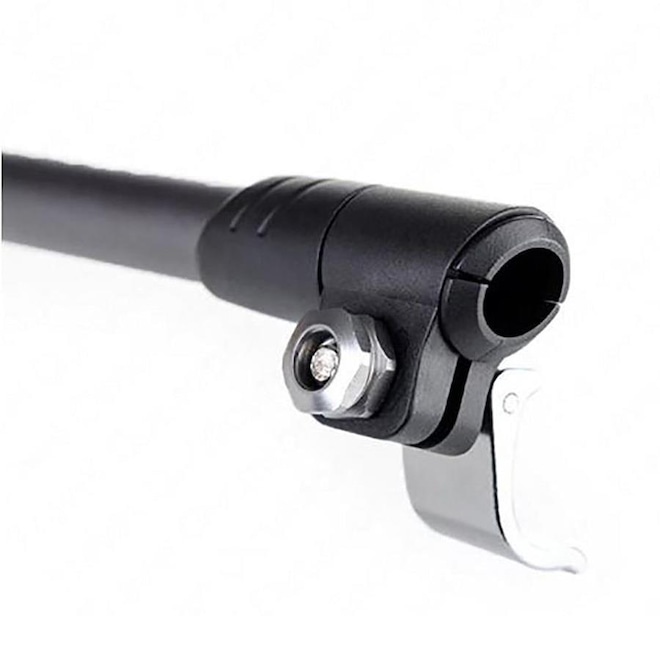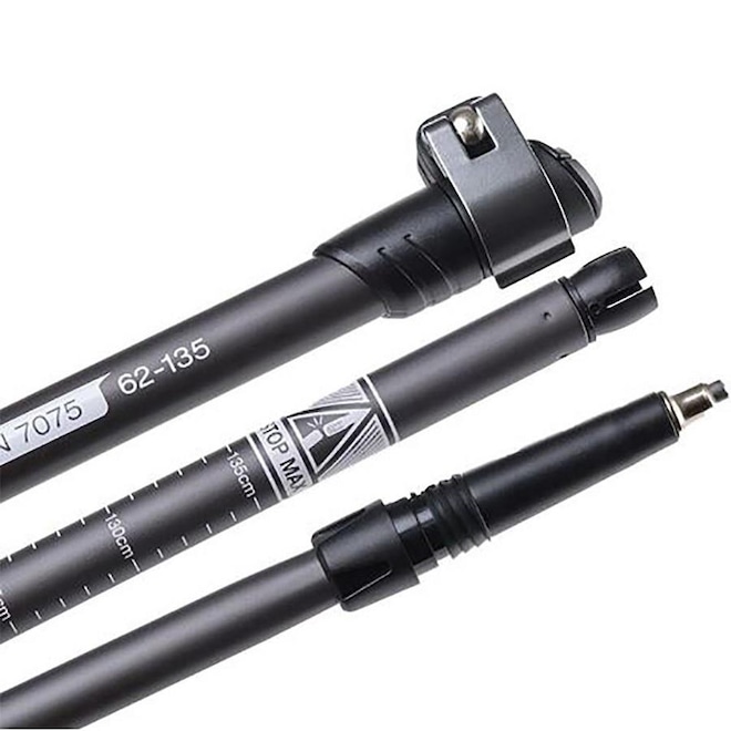 Dividido em três seções, sua regulagem pode variar de 135 cm, comprimento total aberto, ou 62 cm, comprimento total fechado.
