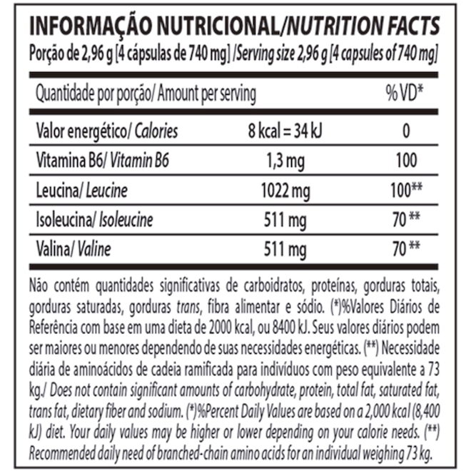 Com 2044 mg de BCAA, vitamina B6 e 1022 mg de leucine, o BCAA Integralmédica é em forma de cápsulas com o objetivo de oferecer ganho de força, massa muscular e recuperação.