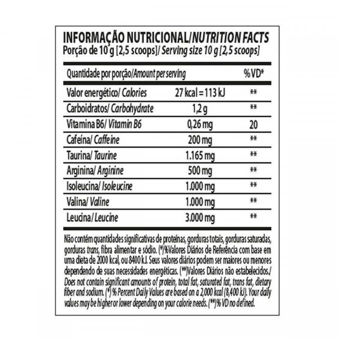 A adição de cafeína aumenta a energia física, e a taurina favorece o foco mental para a realização dos exercícios.
