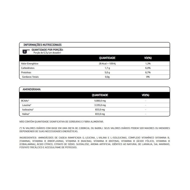 Bcaa Powder (200g) Dux Nutrition Desenvolvido por especialistas dux bcaa poder é composto por aminoácidos de cadeia ramificada especialmente combinados em suas proporções naturais 4 partes de leucina 1 parte de isoleucina e 1 parte de valina Por trás do rótulo os aminoácidos de cadeia ramificada que o nosso corpo não é capaz de produzir são comumente consumidos por atletas que buscam maior suporte nutricional antes e depois dos treinos Benefícios 5000mg de BCAAs na proporção natural Força resistência e proteção muscular Melhor recuperação e síntese muscular após treinos Sugestão de consumo Consuma uma dose 15 minutos antes do treino ou competição Antes do treino amplifique o suporte nutricional para auxiliar a força e a resistência exigidas durante o treino Depois do treino aumente a disponibilidade de aminoácidos durante a fase de recuperação do exercício.