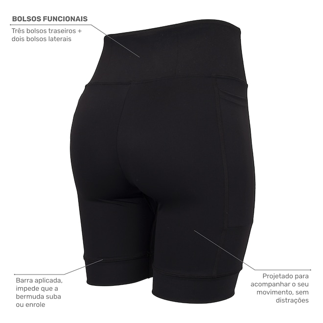 O design conta com cinco bolsos distribuídos de forma estratégica, que oferecem espaço prático e seguro para seus itens essenciais durante corridas, caminhadas ou treinos na academia.
