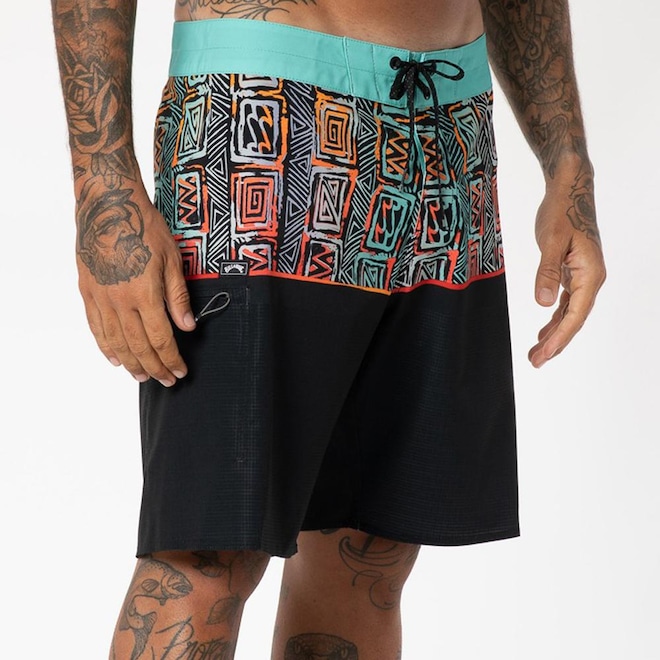 Bermuda Billabong feita em tecido com a tecnologia 4 Way Stretch reciclado, derivado de garrafas pet, repelente a água, secagem rápida, o Airlite apresenta três tecidos de desempenho exclusivos perfeitamente projetados em um para oferecer estabilidade.