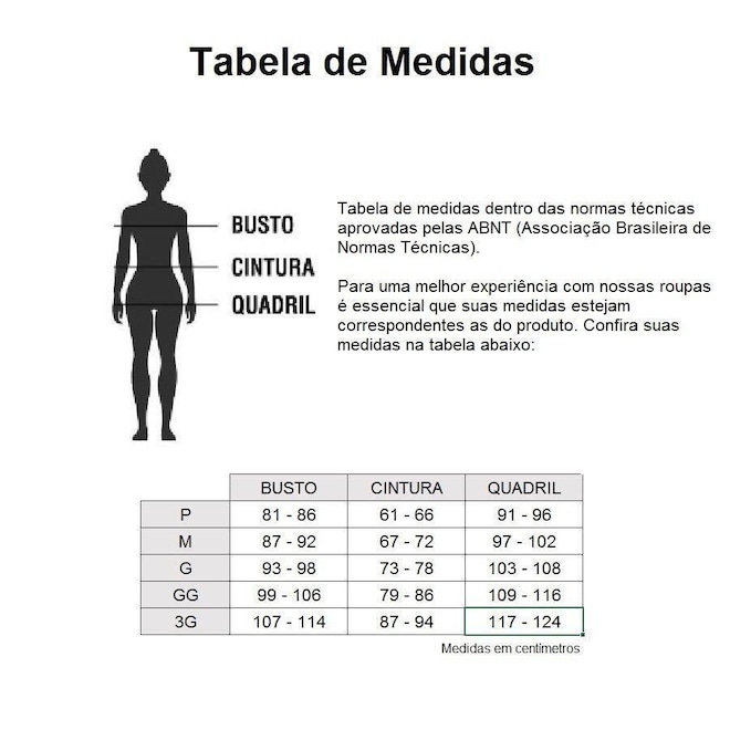 Tamanho GG: Busto (99 - 106 cm), circunferência de cintura (79 - 86 cm), circunferência de quadril (109 - 116 cm)