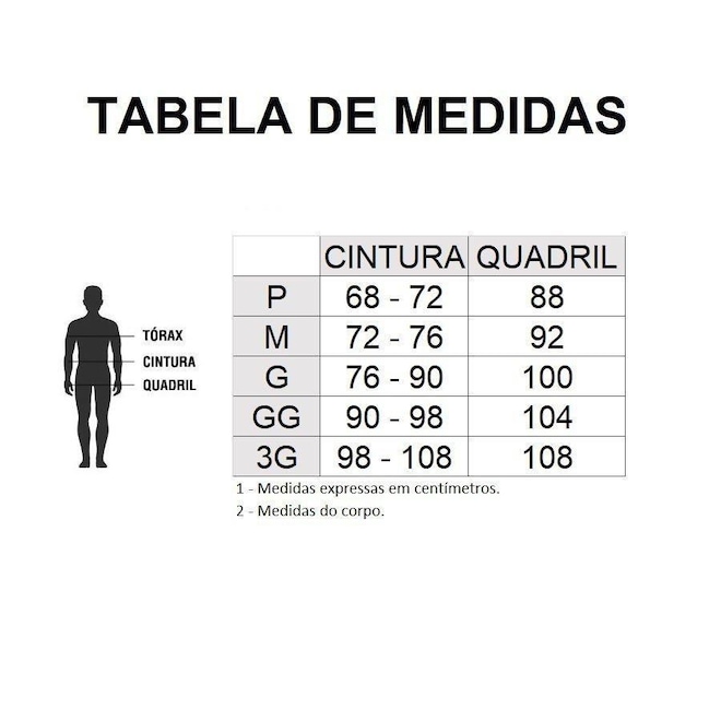 - Tamanho GG: Circunferência de cintura (90 - 98 cm), circunferência de quadril (104 cm).