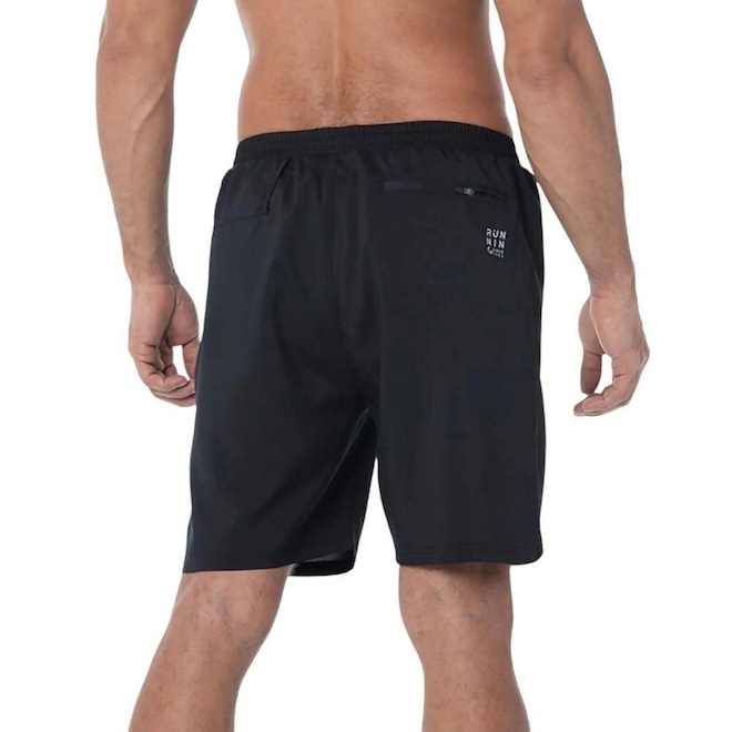 Bermuda em tecido plano de poliéster com elastano. A modelagem das costas é levemente maior que a frente e possui abertura lateral. Costura flatlock na lateral da peça. 2 Bolsos traseiros, sendo um com zíper e o outro para armazenar camisetas. Possui sunga interna. Logo e estampa costas refletivos.