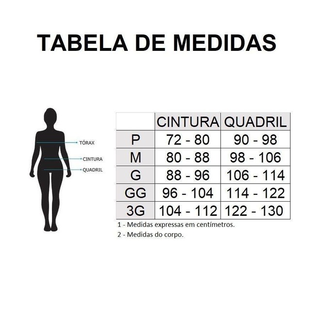 - Tamanho GG: Circunferência de cintura (96 - 104 cm), circunferência de quadril (114 - 122 cm)