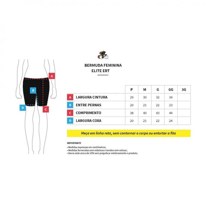 Bermuda de Ciclismo ERT Elite Forro em Gel - FemininaBermuda confeccionada em lycra, com elástico especial nas pernas. Possui recortes anatômicos que proporcionam maior conforto.