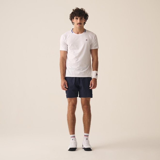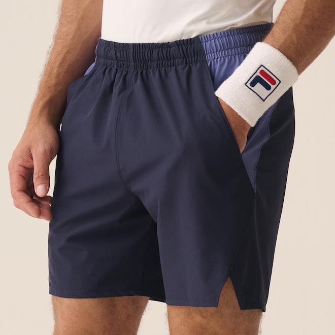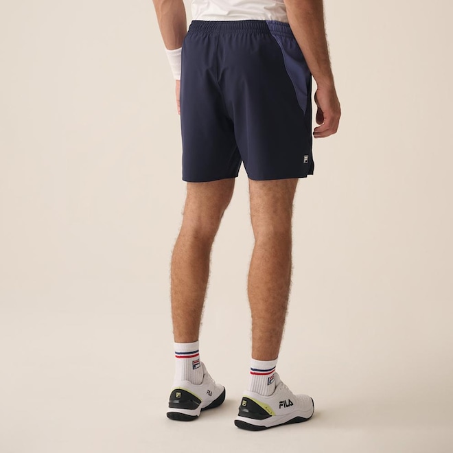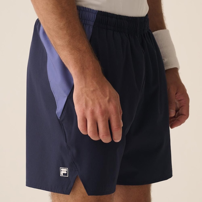 O Short Masculino FILA Match combinam estilo e funcionalidade. Confeccionado em tecido plano de poliéster e elastano, possui modelagem regular, apresenta recortes contrastantes em V e aberturas laterais para maior movimentação. O cós tombado com cordão oferece ajuste personalizado, enquanto os bolsos atoalhados acompanham os recortes, proporcionando conforto adicional. O F-Box na barra lateral traseira completa o visual. Comprimento total: 44 cm.