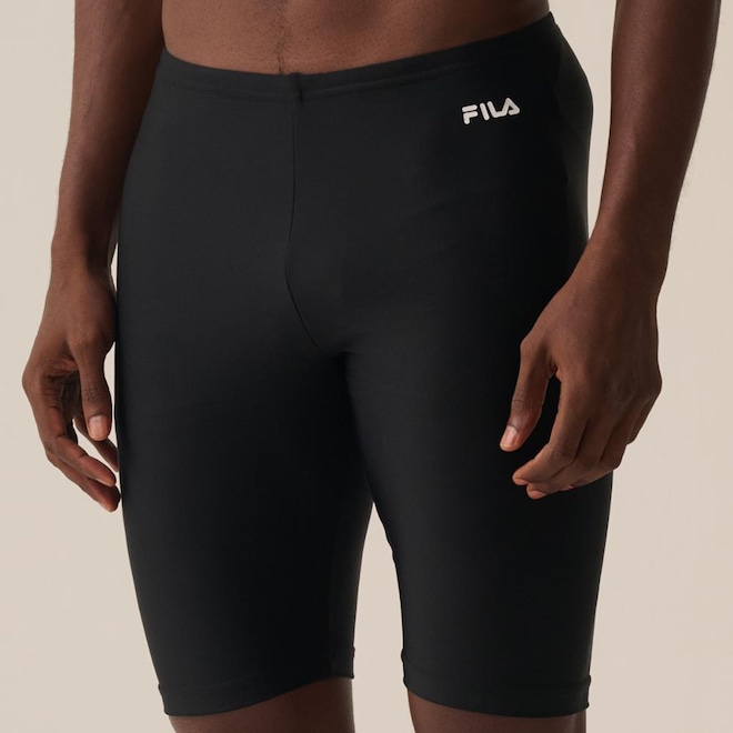 Bermuda masculina desenvolvida em poliamida com elastano. Apresenta as tecnologias UV PROTECTION (proteção solar FPS 50+); RESISTÊNCIA AO CLORO (fio resistente à ação de produtos químicos); e FLOW (elimina o suor). O modelo possui cós com elástico interno para maior segurança. Assinatura FILA Linear na parte frontal.