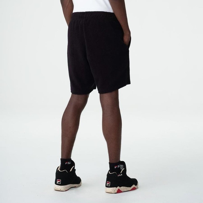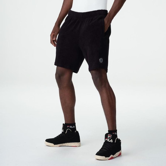 Bermuda masculina confeccionada em moletom sherpa de algodão sustentável com rastreabilidade. Produto ecológico elaborado para causar menos impacto ao meio ambiente, colaborando com a sustentabilidade do planeta. Modelagem regular com comprimento curto. Possui cós elástico com cordão de ajuste externo, bolsos laterais, e etiqueta personalizada Street Express bordada na lateral esquerda próximo à barra. Comprimento total: 46 cm. PRETOref: M0ZVIH