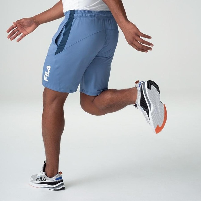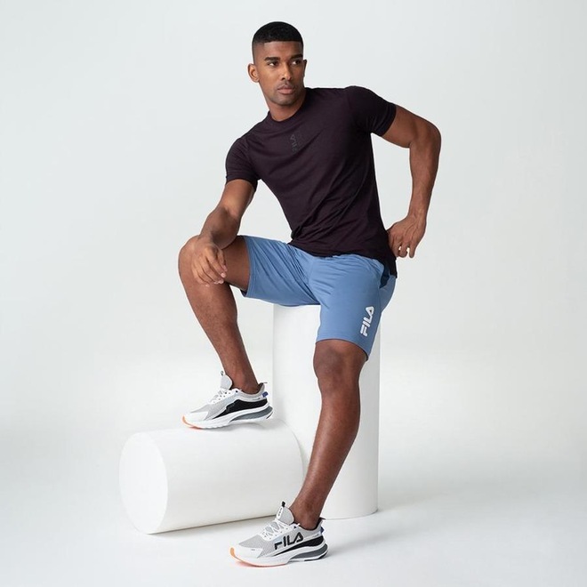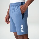 Bermuda masculina confeccionada em moletinho de poliéster com elastano. Modelagem regular. Tecido confortável e maleável. Possui bolsos laterais, cós elástico com amarração interna ajustável, gusset no entrepernas para maior conforto, recorte arredondado na parte frontal e traseira, recorte lateral contrastante aplicado como friso e logo Fila Letter vertical aplicado na lateral esquerda próximo à barra. Comprimento total: 48 cm. | Entrepernas: 22 cm. AZUL DELAVÊ,AZUL MARINHOref: M0ZVP3
