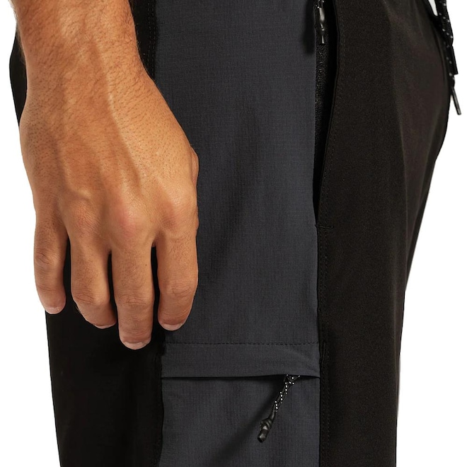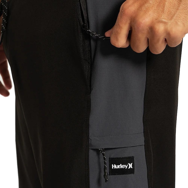 Bermuda Hurley feita em poliamida e elastano, etiqueta ONE&ONLY na lateral, bolsos laterais, recortes laterais com bolso com fechamento com zíper e puxador com elástico.