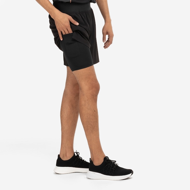 O short interno proporciona compressão e suporte aos músculos, enquanto a camada externa oferece cobertura e estilo.