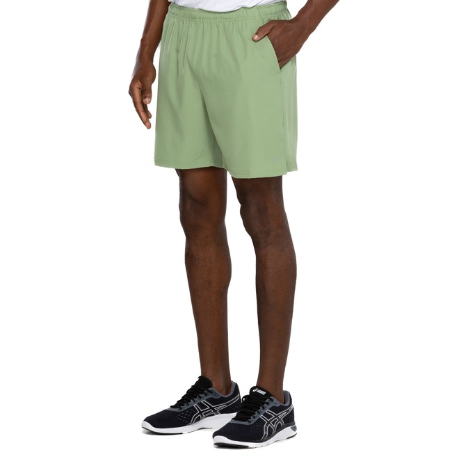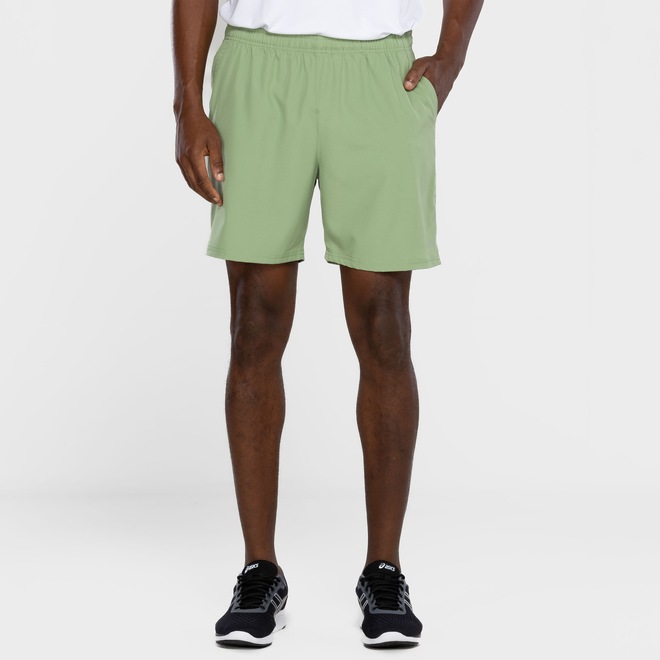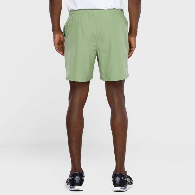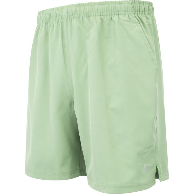 A bermuda masculina é em cós elástico e cordão, com cintura média.
