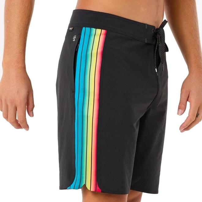 Bermuda Rip Curl com tratamento DWR repelente a água, secagem rápida hidrofóbica, estampa sublimada, bolso invisível com zíper, logo em transfer HD e recortes laterais em Neoprene.