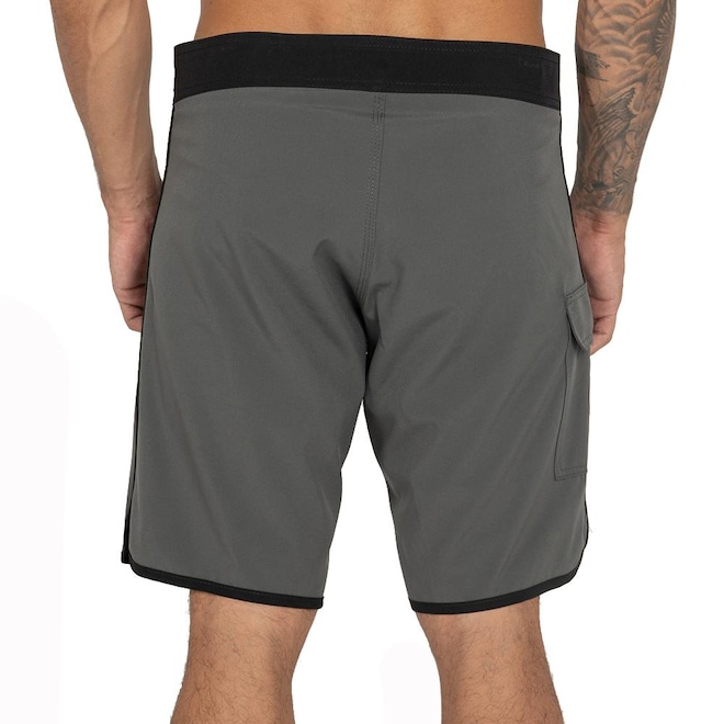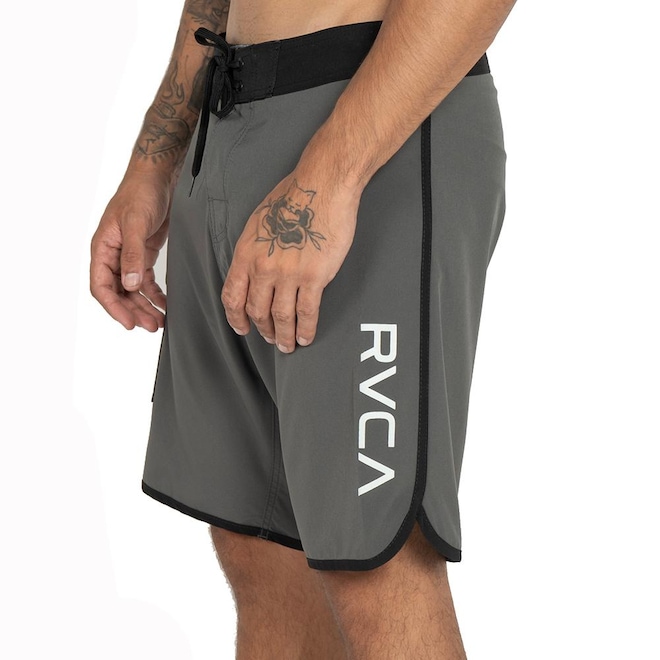 Bermuda Rvca com fechamento em cordão de ajuste externo, 18", laterais e barras com viés aplicado na cor do cós, bolso lateral com patch bordado, lapela e fechamento em velcro e estampa logo na lateral da perna.