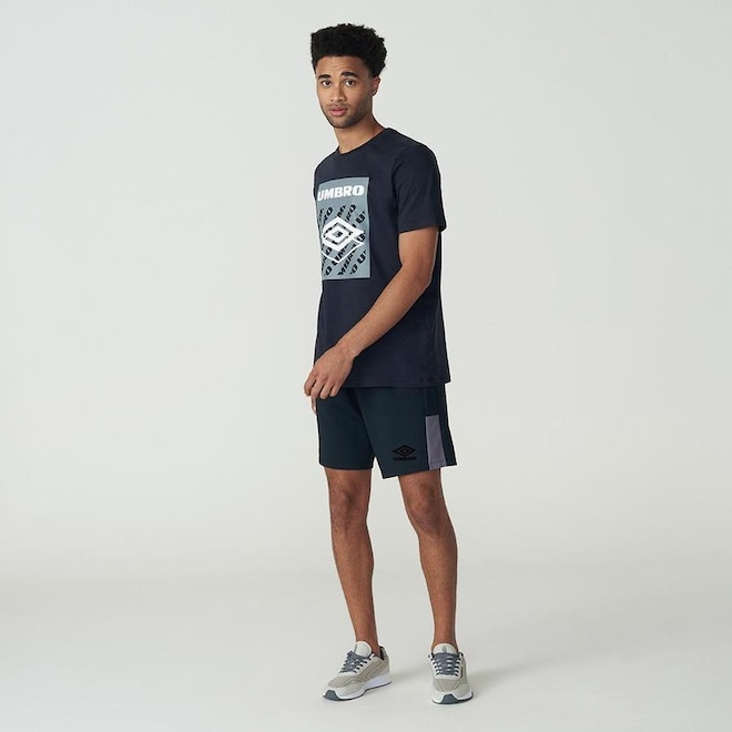 Bermuda masculina confeccionada em poliéster com elastano. Modelagem regular. Possui cós com elástico e cordão de ajuste interno, bolsos laterais, gancho reforçado, recorte contrastante na lateral e logo Umbro em termo 3D aplicado na lateral esquerda próximo à barra.ref: M125N9