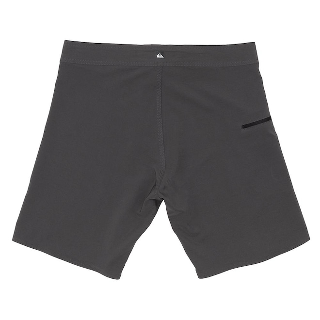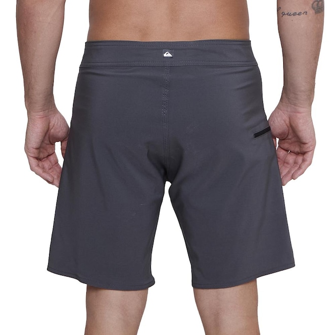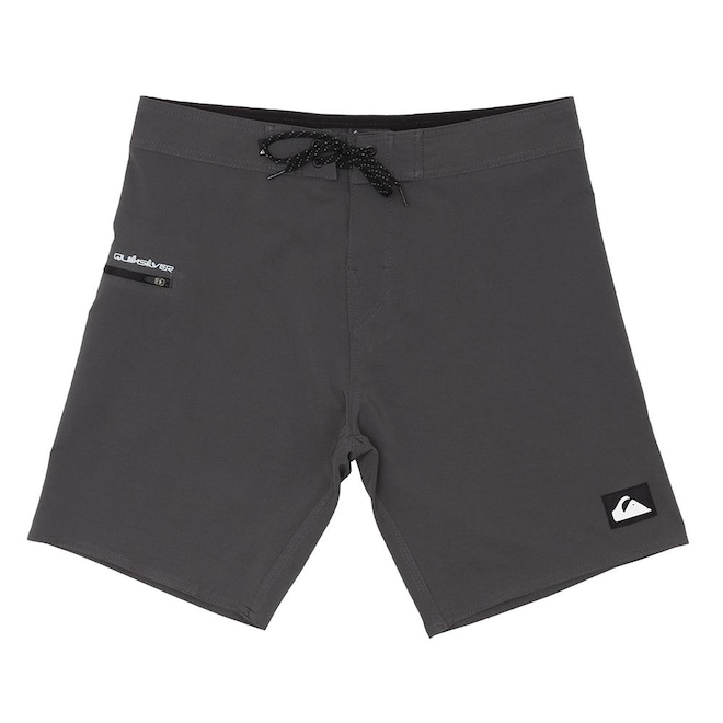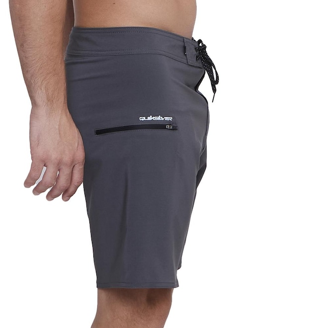 Bermuda QuikSilver feita em tecido 2Way, com elasticidade para 2 lados e repelente à água, cós duplo do contrastante próprio tecido, cordão chato especial, bolso fusionado invertido lateral com aplicação de transfer, etiqueta aplicada na perna esquerda e tecido telado no interno do bolso com aplicação de elástico para chaves.