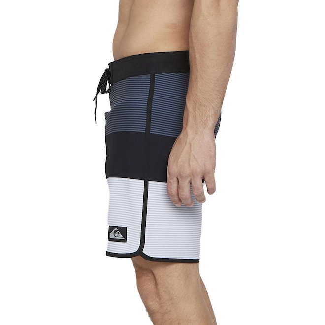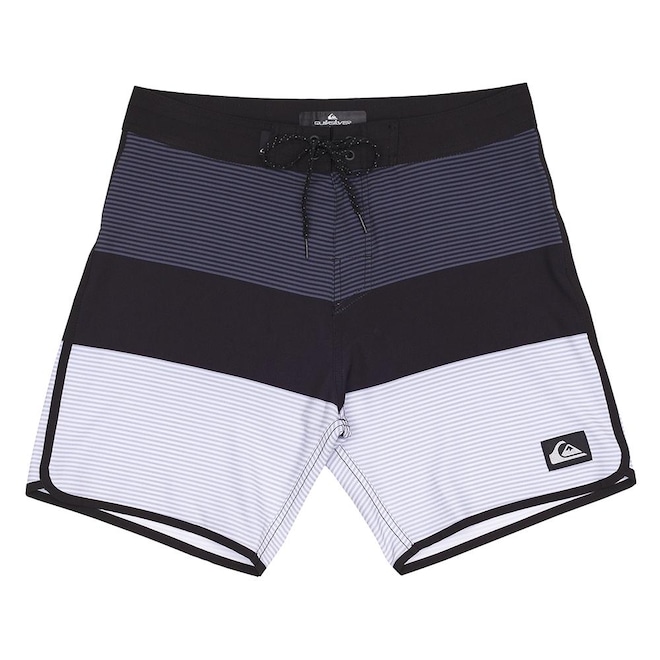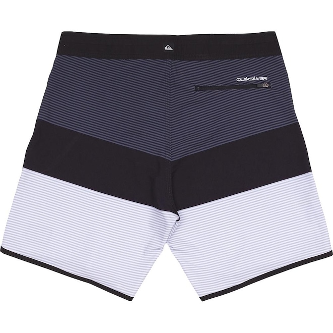 Bermuda QuikSilver feita em tecido 2Way, com elasticidade para 4 lados, cós duplo do contrastante próprio tecido, cordão chato especial, bolso invertido traseiro com aplicação de transfer e fechamento em zíper anti corrosivo, etiqueta aplicada na perna esquerda e tecido telado no interno do bolso com aplicação de elástico para chaves.