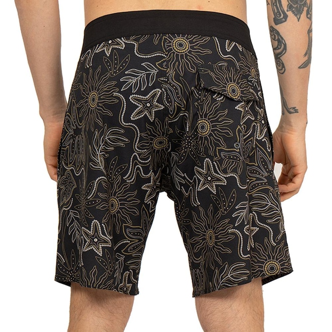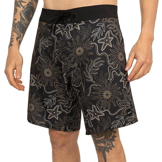 Bermuda Rvca com comprimento de 18 polegadas, fechamento em cordão de ajuste externo, recortes laterais, etiqueta na lateral da perna e bolso chapado traseiro com lapela.