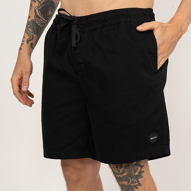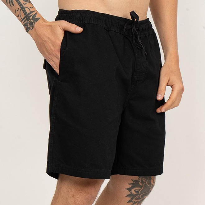 Bermuda Rvca feita em tecido de sarja leve, bolsos faca na frente, patch aplicado na perna, bolso chapado traseiro com lapela e etiquetas personalizadas da marca.