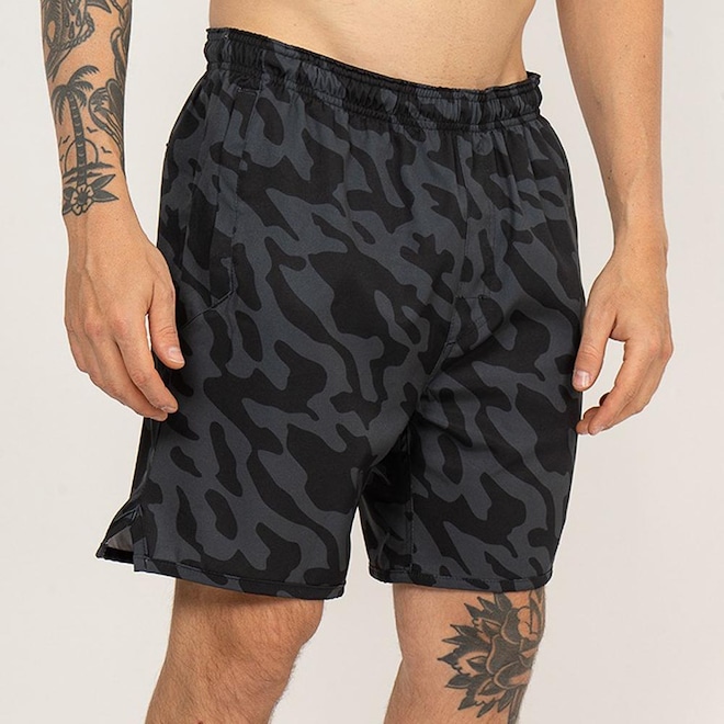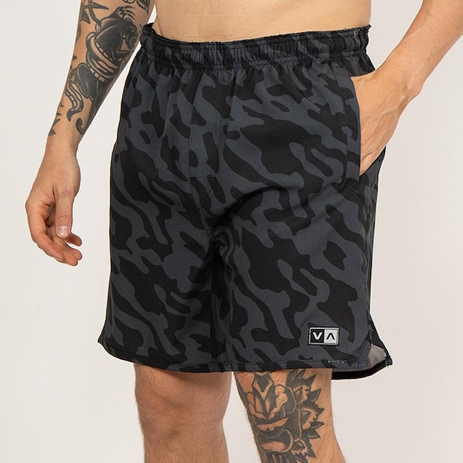 Bermuda Rvca feita em tecido Bi-Stretch, tecido de alta elasticidade, comprimento 17 polegadas, cós com elástico personalizado e cordão no interno para ajuste, recorte nas pernas, bolsos laterais embutidos em tecido mesh, bolso traseiro embutido com fechamento em zíper, estampa sublimada full print militar e etiquetas personalizadas.