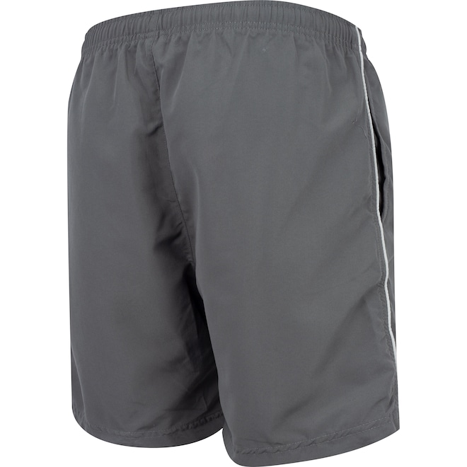 A bermuda masculina é em cós elástico e cordão, com cintura média.