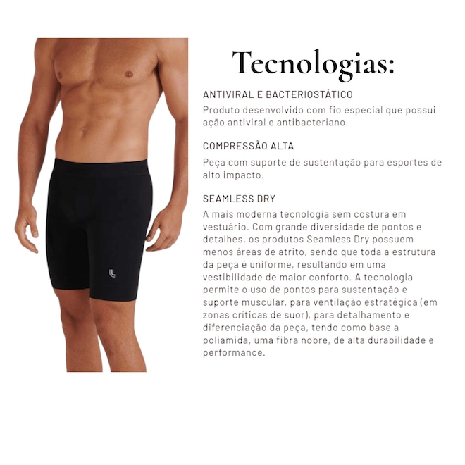 Bermuda justa ao corpo para atividades de alto impacto. Confeccionada em Seamless Dry que proporciona maior respirabilidade ao corpo e secagem rápida do suor. Desenvolvido com diferentes níveis de compressão, possui ação que melhora a postura corporal e o contrapeso do músculo. O fio Amni Off ainda garante ação antiviral e antibacteriana.