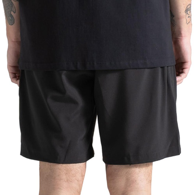 Bermuda Volcom com bolso faca lateral, bolso traseiro com lapela e etiqueta Volcom, elástico no cós, ajuste com cadarço e patch Volcom Stone lateral.