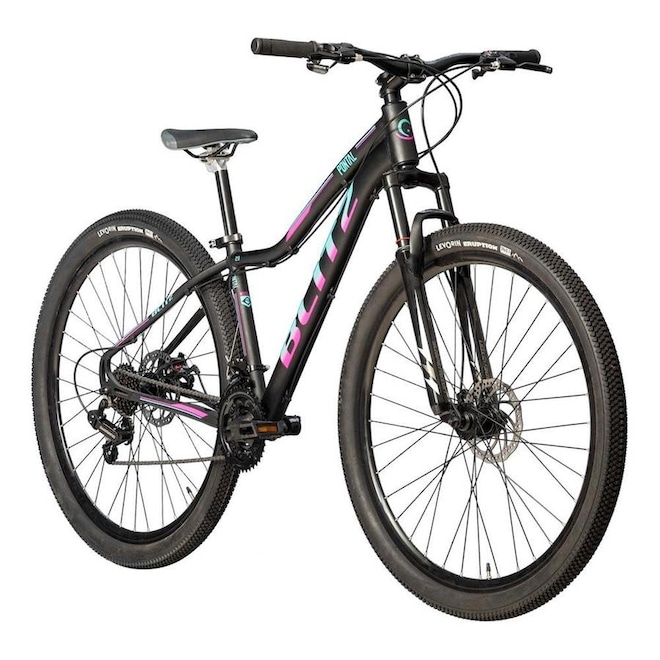 Bicicleta 29 BLITZ Pontal Feminina Alumínio Shimano 21v Freio a Disco A BLITZ Pontal é uma mountain-bike feita para quem procura qualidade, economia e modernidade. Ela oferece um design para todos os gostos e é adequada a trilhas, estradas sinuosas da cidade e demais aventuras. É composta por quadro de alumínio 6061, câmbio Shimano com 21 velocidades, suspensão com base de alumínio e freios à disco mecânico. Além disso, o design arrojado e cores vívidas fazem desta bike uma opção muito atrativa. A BLITZ Pontal é a melhor opção para quem busca o melhor custo-benefício em uma bike MTB com agilidade, segurança, resistência e leveza.