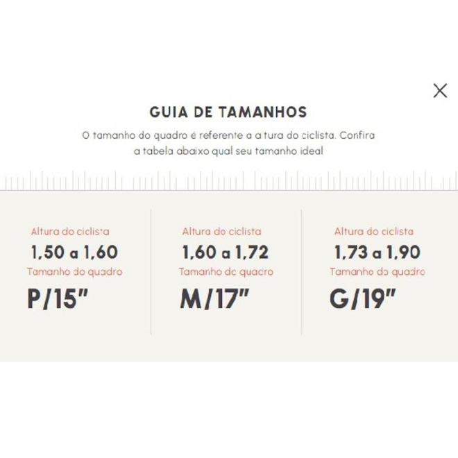 - Altura do ciclista: 1,59 até 1,76m ? Tamanho de quadro 15´´