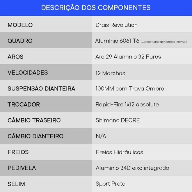 Bicicleta Aro 29 - Drais Revolution - Freio a Disco - Câmbio Shimano Deore - 12V