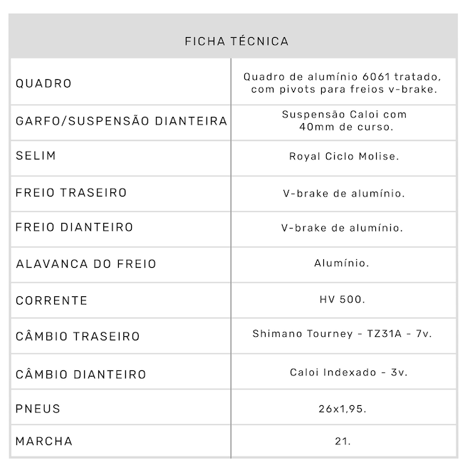 Apresenta quadro leve em alumínio, freios V-Brake que conferem pouca manutenção, além de manoplas emborrachadas e ergonômicas para mais comodidade.